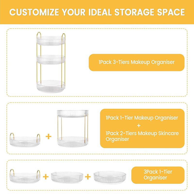 Effortless 360° Rotation: Designed for convenience, our skincare organizers features a reinforced base and a whisper-quiet rotating mechanism that ensures smooth, wobble-free spins. The raised guardrails securely hold items in place, allowing you to find your essentials instantly without worry of them falling.